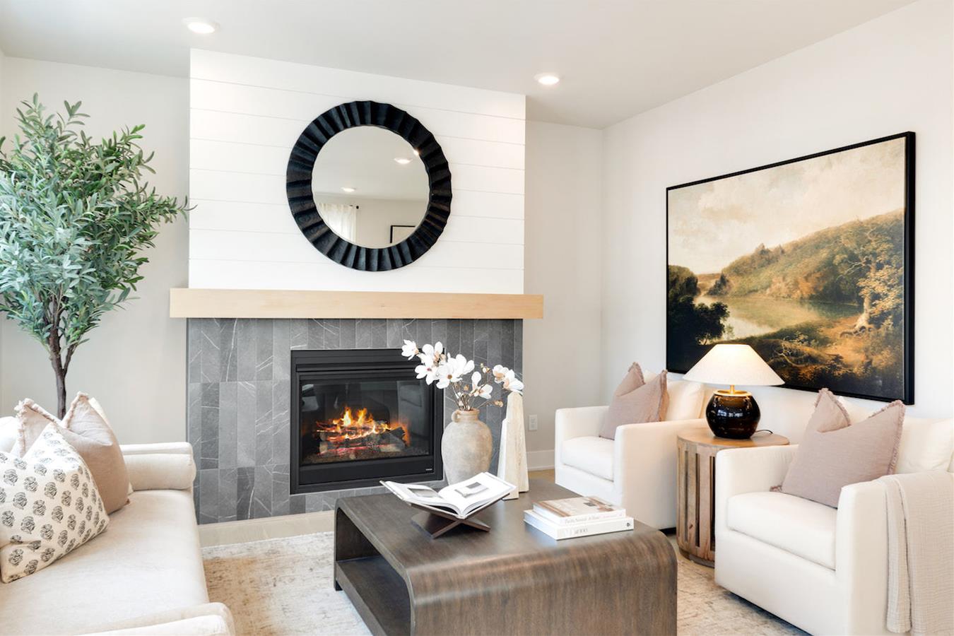 • Gas Fireplace in Livingroom with Custom Mantle and Tile Surround