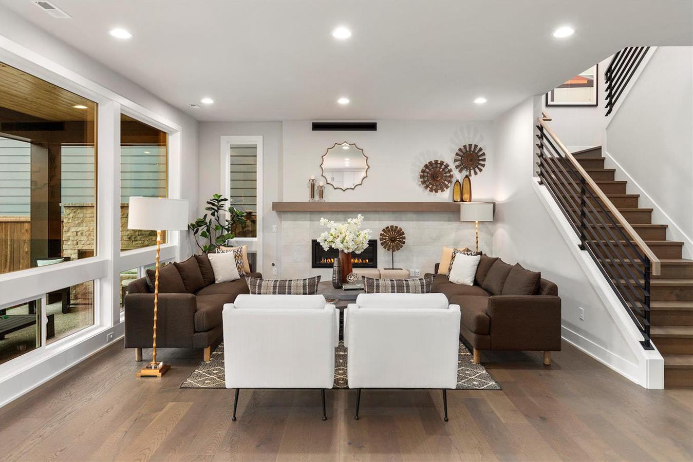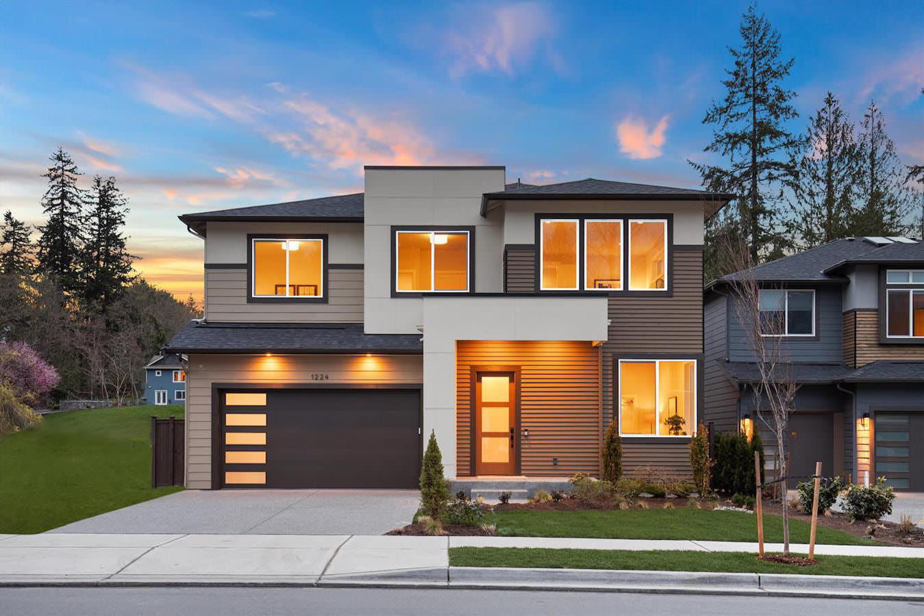 • Modern front elevations with oversized windows and decorative stone