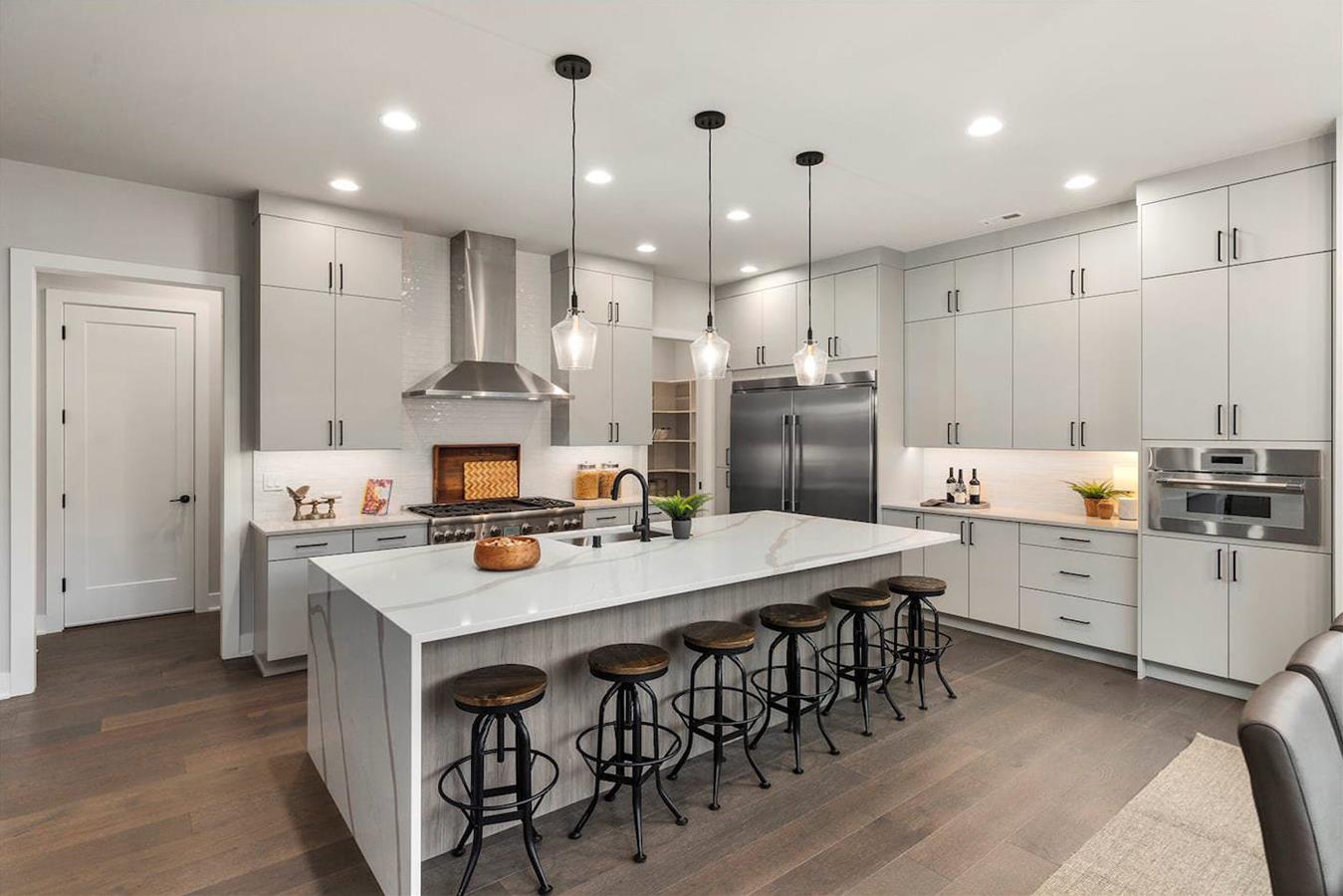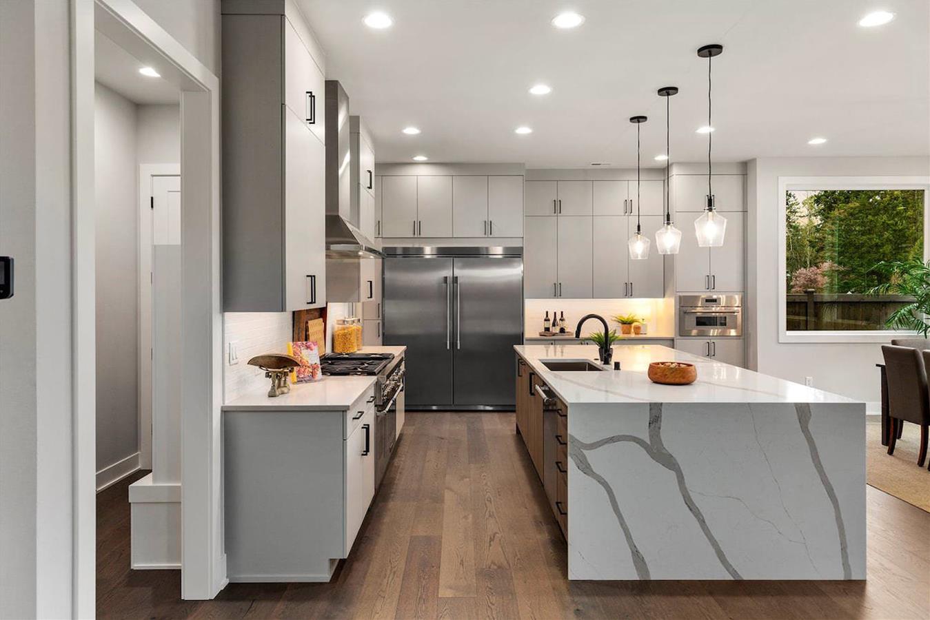 • Stunning waterfall slab at kitchen island