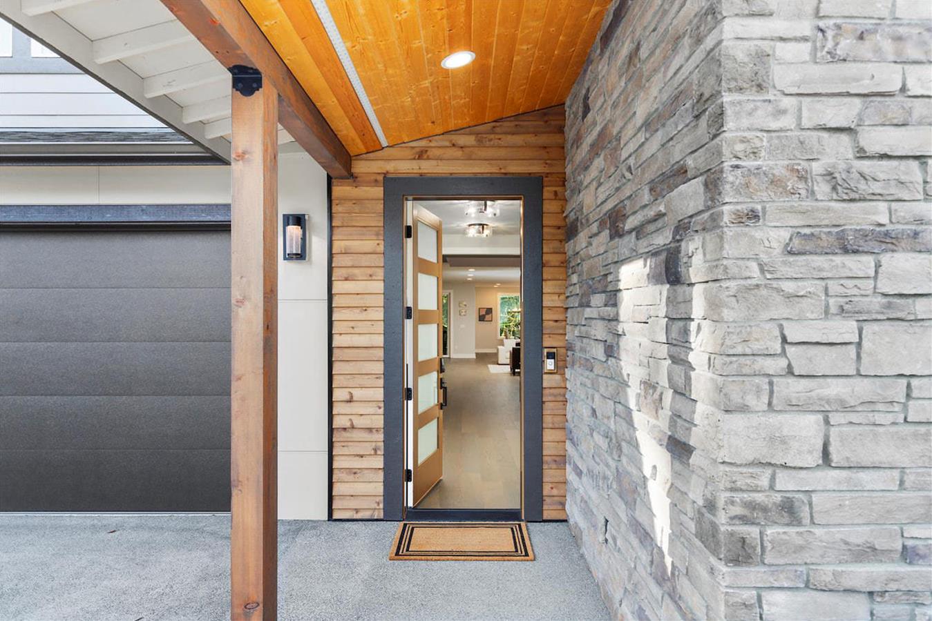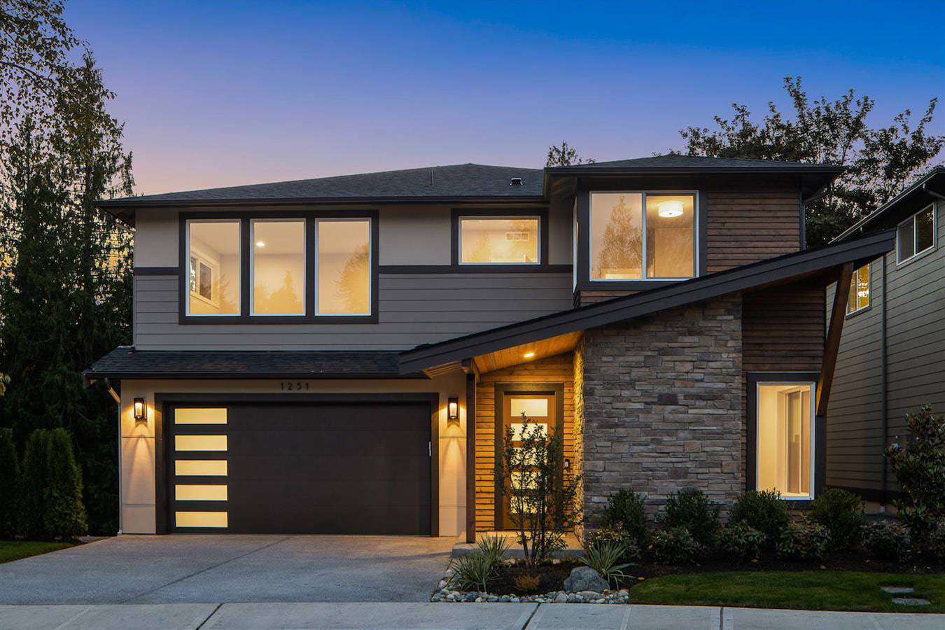 • Modern front elevations with oversized windows and decorative stone