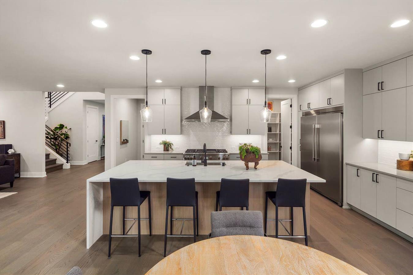 • Stunning waterfall slab at kitchen island